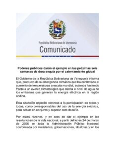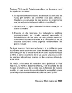 Ante la emergencia climática que ha ocasionado el aumento de temperaturas a escala mundial, el Gobierno de la República Bolivariana de Venezuela anuncia una serie de acciones a ser aplicadas por la Administración Pública Nacional a partir de este lunes 24 de marzo de 2025: