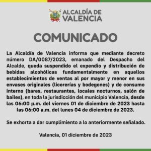 La prohibición de venta y distribución de licores estará vigente desde las 06:00 de la tarde del viernes, hasta las 06:00 de la mañana del lunes 4 de diciembre, en todo el municipio Valencia.