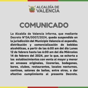 El decreto establece la suspensión del expendio y distribución de bebidas alcohólicas en aquellos expendios al por mayor y menor en sus envases originales en licorerías y bodegones, y de consumo interno, como bares, restaurantes, locales nocturnos, cantinas, salón de bailes, en toda la jurisdicción del municipio Valencia.