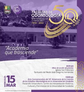 En el marco de esta importante fecha, la decana Yngrid Acosta Maracara, acompañada de la Comisión Organizadora, invitan a toda la comunidad ucista y extrauniversitaria, a la celebración del Acto Conmemorativo del 50° Aniversario de los Estudios Odontológicos en la Universidad de Carabobo, a realizarse este 15 de marzo a las 10:00 am, en el Paraninfo de la UC, ubicado en el Centro de Interpretación Histórica, Cultural y Patrimonial, antigua sede de la Facultad de Derecho.