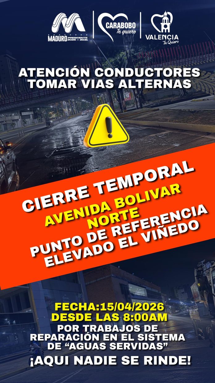 La Alcaldía de Valencia, a través de la Dirección de Servicios y Obras Públicas, ha iniciado un operativo de mantenimiento mayor en la red de aguas servidas del Eje Norte de la ciudad, acción que ameritará el cierre temporal de la Av. Bolívar, a la altura del Elevado de El Viñedo, sentido Naguanagua-Centro, este miércoles 15 de abril a partir de las 08:00 de la mañana.
