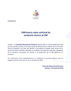 Este viernes 2 de junio la Comisión Nacional de Primaria informó que, en sesión sostenida este día, aprobó solicitar al Consejo Nacional Electoral (CNE) una reunión de la Comisión Técnica Conjunta para avanzar en la solicitud de asistencia técnica del ente electoral, tomando en consideración que ofrezca garantías a los electores como la protección de la identidad.