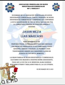 La Asociación Venezolana de Buzos Industriales y Comerciales confirmó este 5 de marzo de 2023, a través de un obituario, el fallecimiento de Jasón Meza y Liam Marcano.