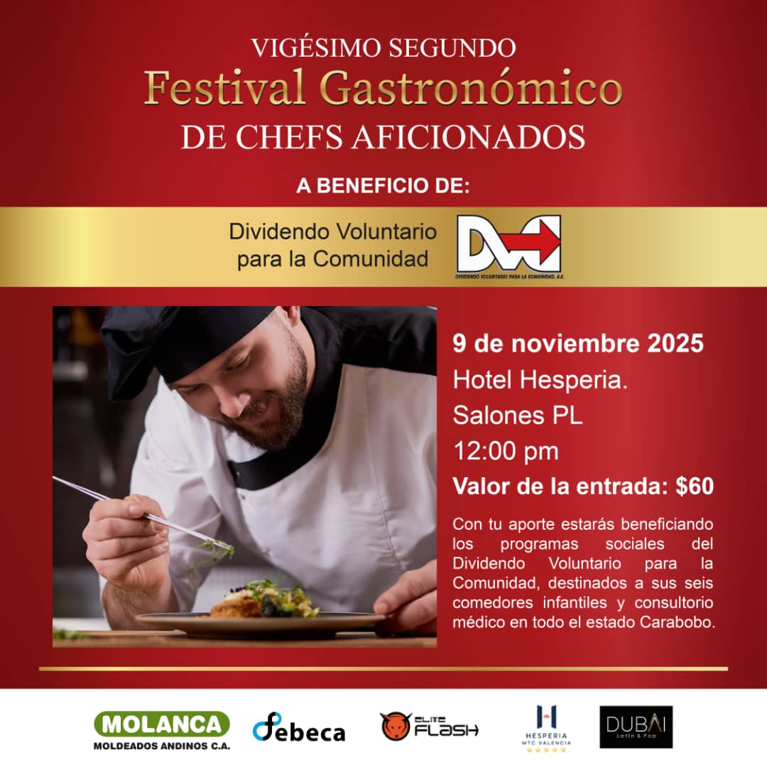 El XXII Festival Gastronómico de Chefs Aficionados del Dividendo Voluntario para la Comunidad (DVC), Carabobo se llevará cabo este domingo 9 de noviembre a partir de las 12 del mediodía.