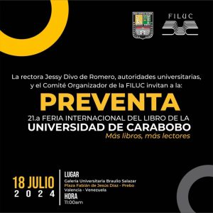 La Feria Internacional del Libro de la Universidad de Carabobo (Filuc) anuncia la realización de su Preventa 2024 para este jueves 18 de julio, a las 11:00 am en los espacios de la Galería Universitaria Braulio Salazar, en la plaza Fabián de Jesús Díaz, en Prebo.