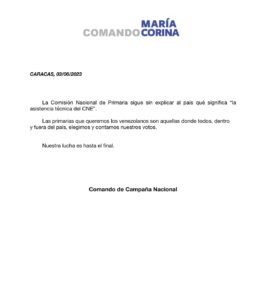 En ese sentido, el comando de Maria Corina Machado respondió diciendo: «la Comisión Nacional de Primaria sigue sin explicar al país qué significa la asistencia técnica del CNE».