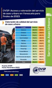 Según los resultados publicados recientemente por el Observatorio Venezolano de Servicios Públicos (OVSP), sobre un sondeo realizado a finales de 2023, Valencia es la ciudad con mejor valoración positiva en cuanto al acceso al servicio de recolección de desechos y aseo urbano
