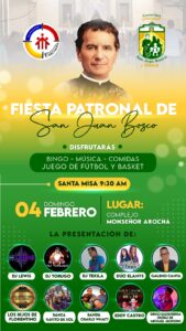 El Domingo 04 de Febrero se desarrollará la Jornada de fiesta Patronal, en el complejo cultural y educativo Monseñor Arocha, ubicado en el barrio El Concejo. Se dará inició a las 08:00 am, con una Caminata festiva, que partirá desde la Redoma El Boquete, al ritmo de la banda de la Casa Don Bosco. En procesión se llegará al Centro Juvenil Mons Arocha, para la Santa Eucaristía a las 09:30 am.