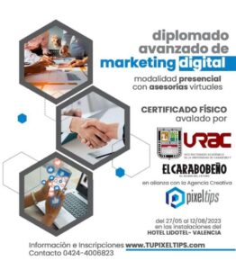 El Vicerrectorado Académico de la Universidad de Carabobo en alianza con El Carabobeño y la Agencia Creativa Pixeltips, ofrecen el Diplomado Avanzado de Marketing Digital, que iniciará el próximo 27 de mayo y anuncia que están abiertas las inscripciones.